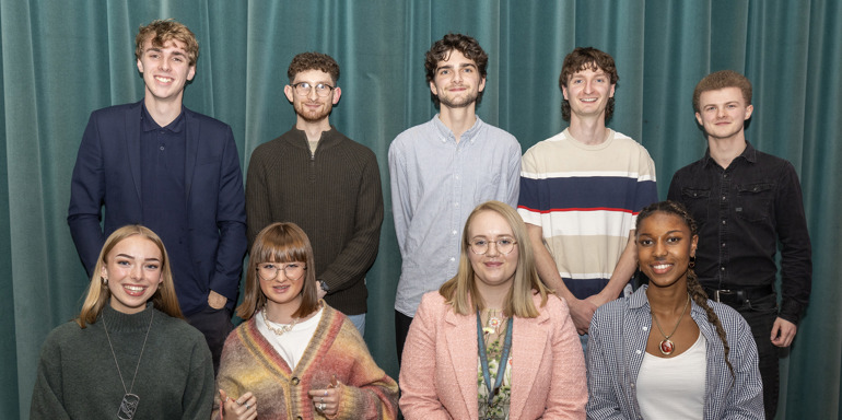 The interns, composers and mastering engineer in attendance. Front row (pictured left to right) Evie Kitching, Eliana Harrison aka EL!ANA, Chloe Simmons, Kea Bell. Back row (pictured left to right) Peter Norris, Sam MacDonald, Ethan Glover, mastering engineering Max Lewis, Ike Greenwood
