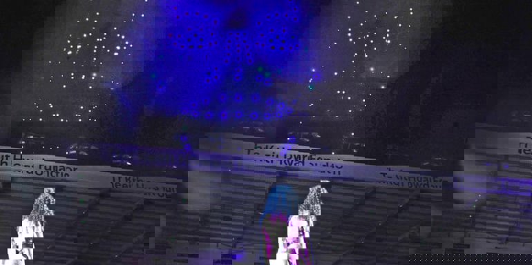 The show concluded with a stunning drone display depicting an awakening giant appearing above the stadium before bursting into individual lights handed out to audience members on entry.