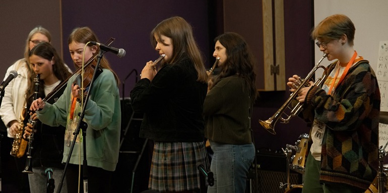 22 female and nonbinary musicians, aged between 8 and 15, were welcomed to Leeds Conservatoire on 2 March to experience jazz music and improvisation in a supportive environment. Thanks to support from Arts Council England and Leeds Music Education Partnership, the conservatoire was able to offer free places to individuals studying or living in Leeds.