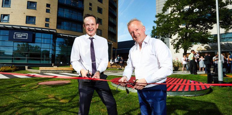 LeedsBID Chief Executive, Andrew Cooper, and LCoM Principal and Managing Director. Gerry Godley, cutting the ribbon to officially open St Peter's Square.